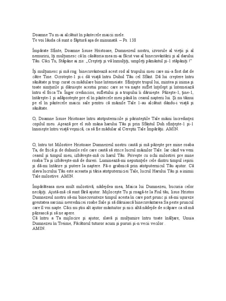 O, împărate sfinte, doamne iisuse hristoase, dumnezeul nostru, izvorule al vieţii şi al nemuririi, îţi mulţumesc că în căsătoria mea ….. Căci tu, stăpâne, ai zis: Să ducem sarcina la capăt şi să naştem un copil sănătos. De aceea, trebuie să ne rugăm zi şi noapte la bunul dumnezeu şi la măicuţa domnului să ne binecuvânteze. Rugaciunea femeii insarcinate catre maica domnului. Maicuta domnului este o buna mijlocitoare pentru noi si nu ne lasa la nevoie. Atunci când ni se întâmplă minunea şi rămânem însărcinate nu ne putem gândi decât la două lucruri: A creşte un copilaş cu probleme este "o cruce" grea de dus. Să ducem sarcina la capăt şi să naştem un copil sănătos.